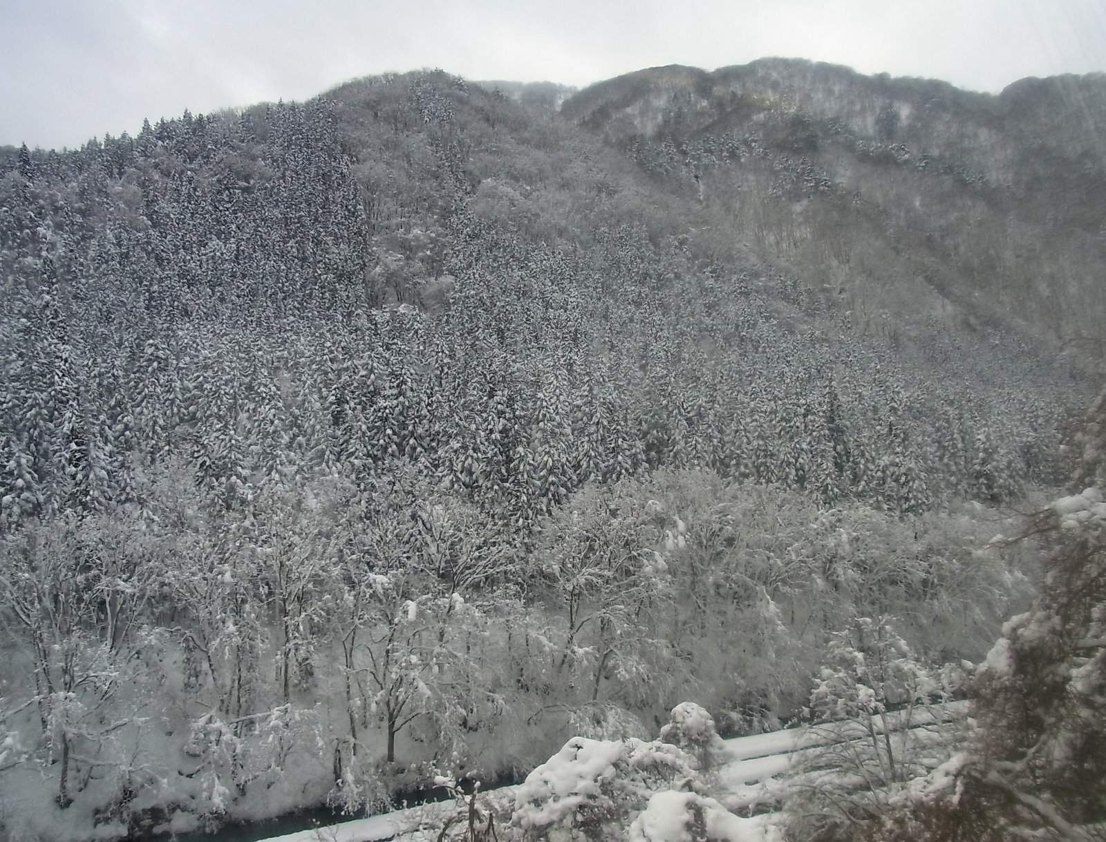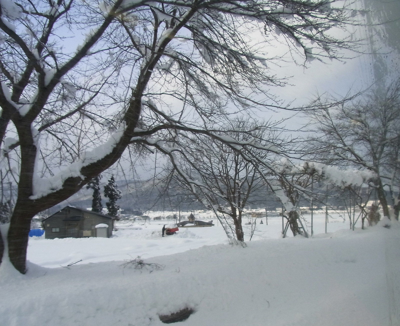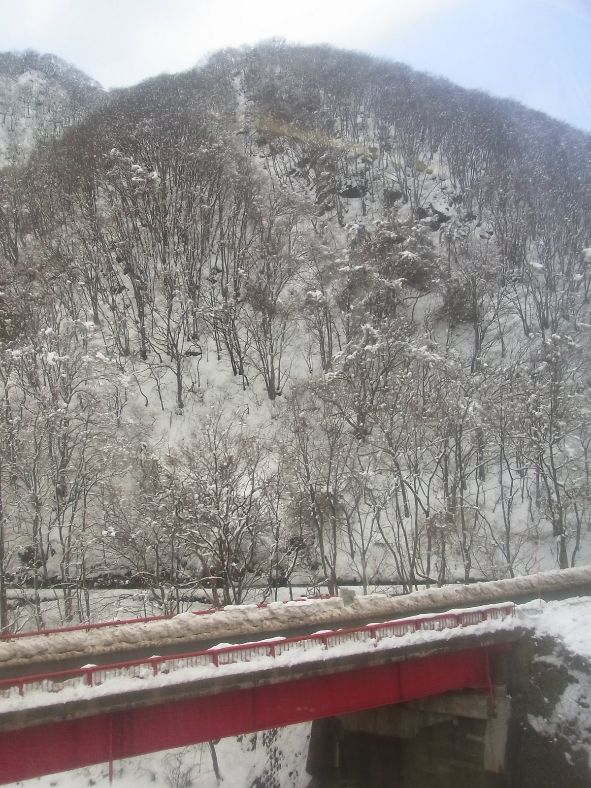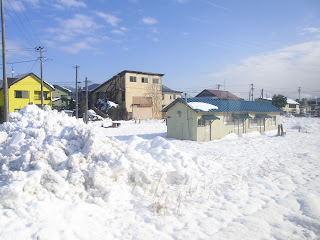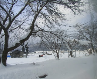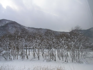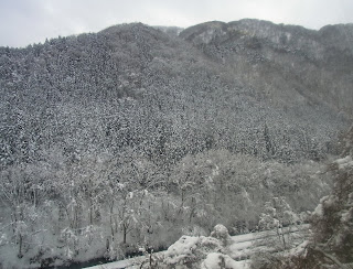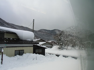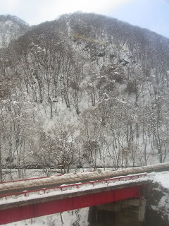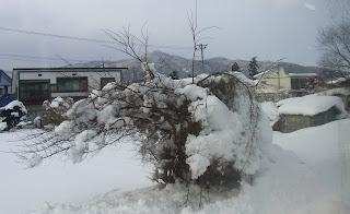 Most of these photos were taken on the Hanawa railway line on the way back to Morioka from Odate. The train line makes its way through the mountains that divide Akita from Iwate, through national forests, tired onsen towns, old mining areas. In winter the snow can be very deep. There was serious snow while we were up in Odate - more than 60cm in one day (areas around Tottori much further south had extreme snow). The snow that was falling was 'bota yuki' - wet and heavy snow (as opposed to dry powdery snow). My uncle's saying 'snow is pretty on a postcard' has more than a grain of truth. It is pretty - and the Hanawa line (which takes longer than the bus, even when it's the express) is one of my favourite trainlines in Japan so far - along with the Uetsu line from Murakami to Sakata in Niigata / Yamagata. But shovelling snow wears thin after a while, and it makes for treacherous driving conditions, particularly when it melts and refreezes.